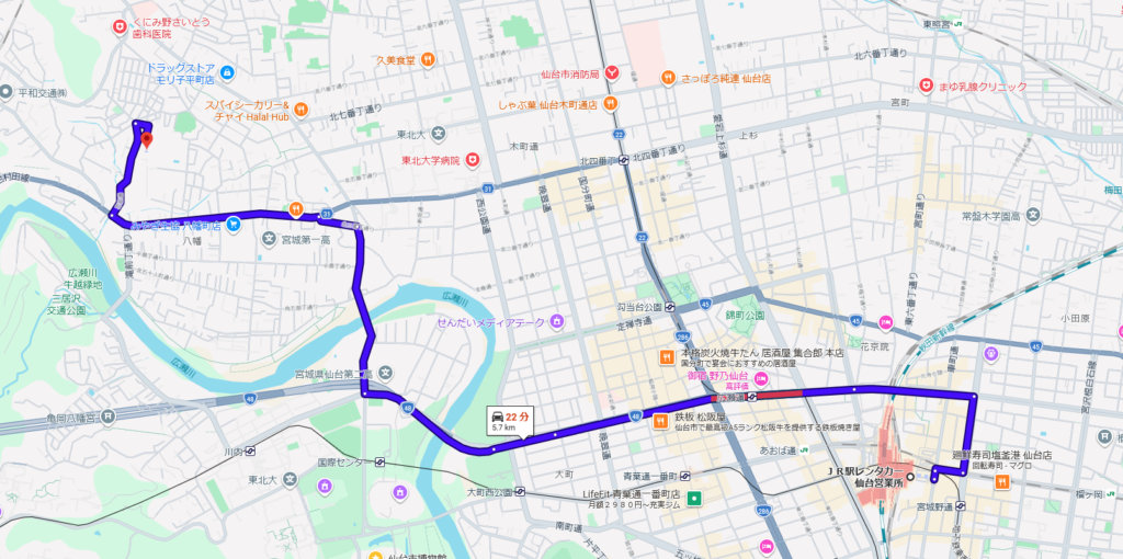 この5件の国宝は、仙台駅から半径24㎞以内にあり、車の使用が効率的と考え回りました。現地の駐車場事情も含めて書いていきたいと思います。スタートとゴールは仙台駅です。